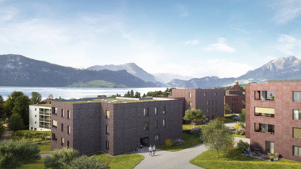 Das Projekt umfasst 7 Mehrfamilienhäuser mit 82 Mietwohnungen und einer gemeinsamen Einstellhalle.